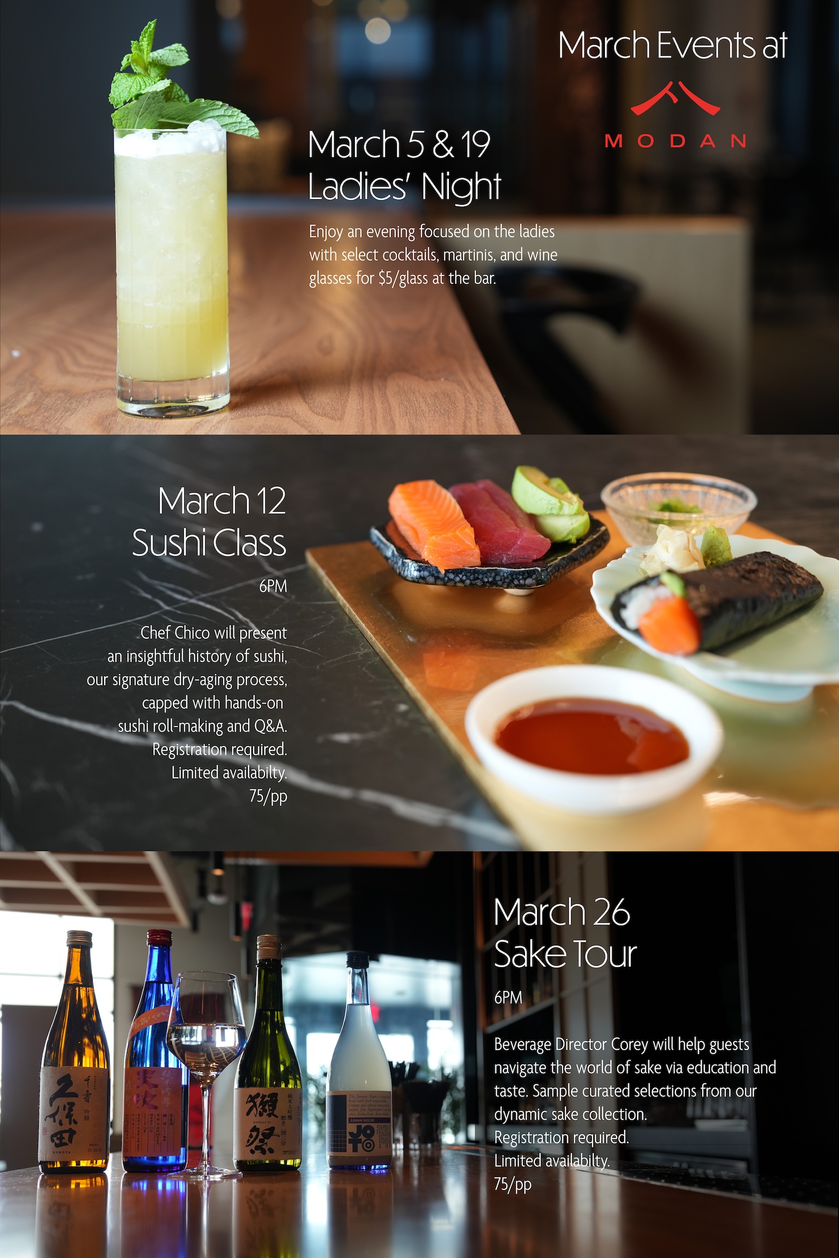 Modan will be converted to a unique open experience, with various featured food stations that will be serving our Wagyu Dumplings, Handrails, Oyster Bar selection, and more.